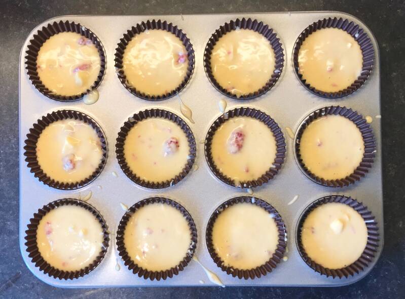 - Divide the mixture evenly between the 12 muffin cases.