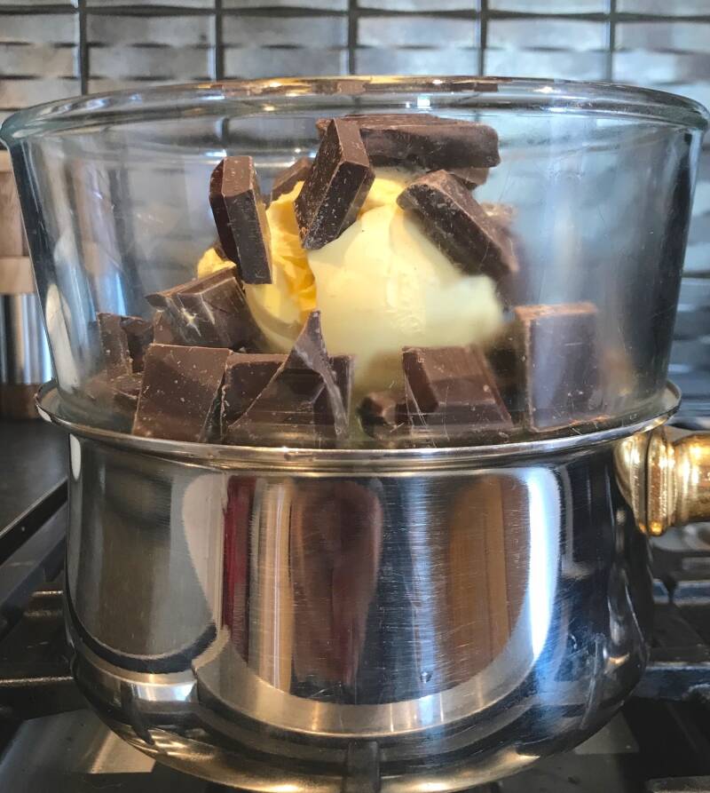 - Cut the dark chocolate and butter into chunks and place in a glass bowl together. Half-fill a saucepan with water and put it on the hob. Place the glass bowl on top of your saucepan - make sure the bottom of the bowl doesn't come in contact with the water (you want the steam to melt the chocolate & butter). Slowly melt the chocolate and butter together (on low), stirring every so often. This may take a while, but patience is key - you don't want it to burn!