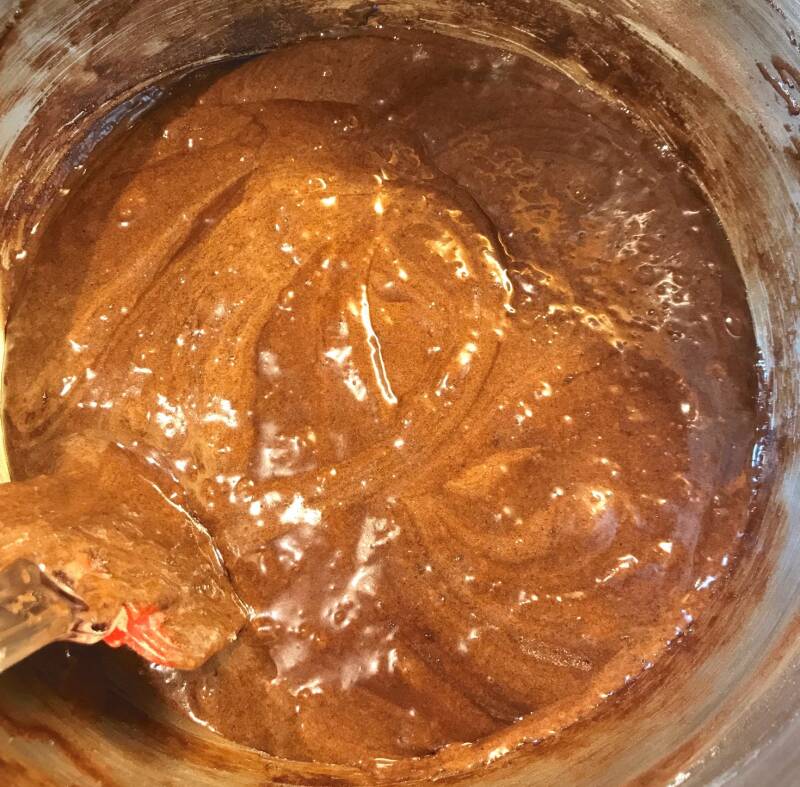 - Pour the cooled chocolate & butter mix into the egg mix and using a spatula, fold in slowly to combine (you don't want to knock out all the air that's just been whisked in).