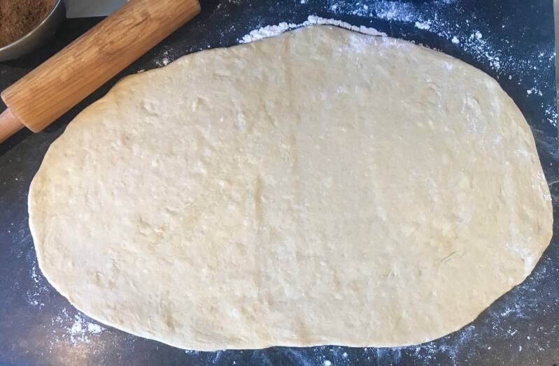 8. After proving, the dough should have roughly doubled in size and be light and airy - if not, leave it a little while longer. When your dough is ready, place on a floured surface and roll it out into a 14"x24" rectangle.